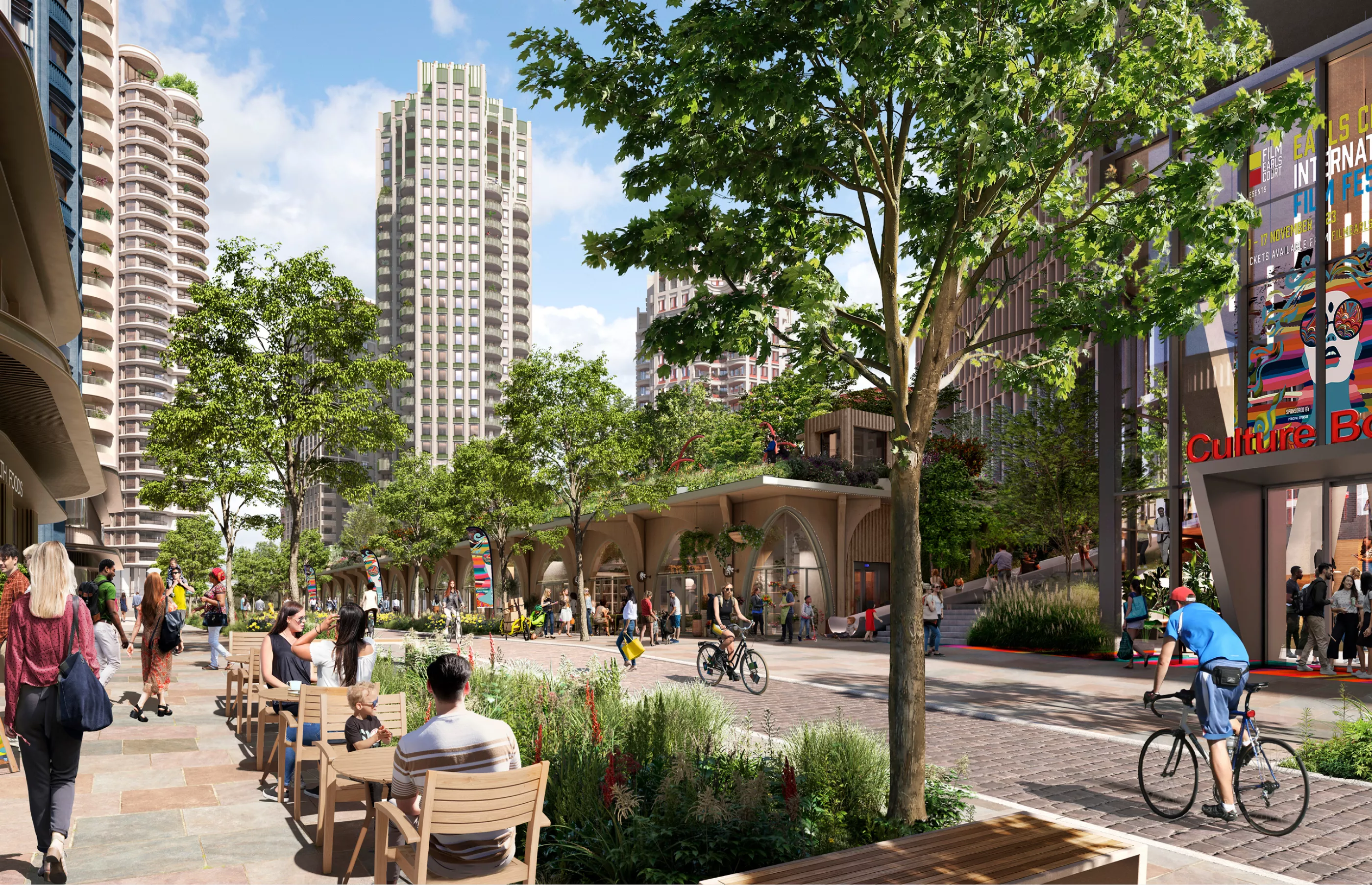 Over the coming two decades, the masterplan provides a framework for 7.5 million sq ft of development, including around 4,000 new homes, three cultural venues, and 2.5 million sq ft of workspace focused on climate innovation. Set within 20 acres of public realm and green space, the proposals seek to create an inclusive and generous piece of city, reconnecting Earls Court to its surroundings and establishing a place designed to endure.